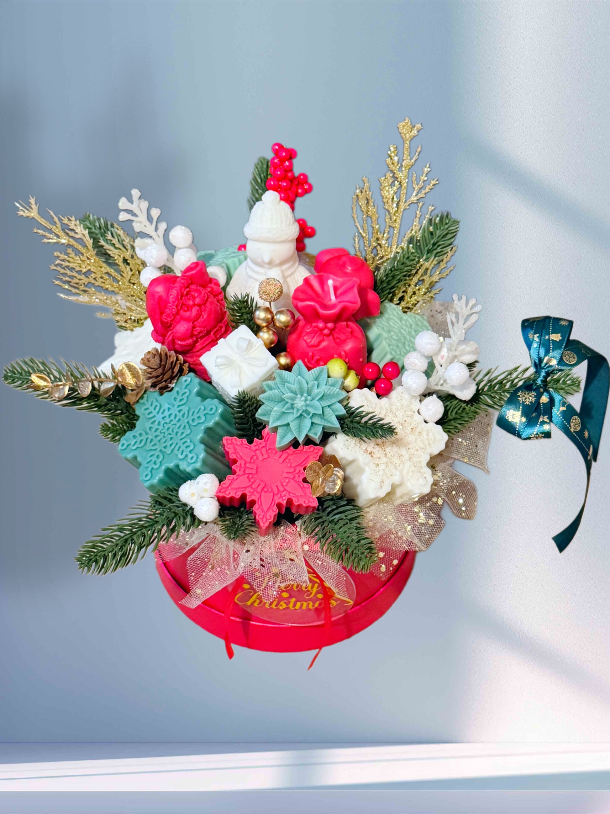 Bring festive charm to your home with this elegant Christmas arrangement nestled inside a rich red gift box. The box is filled with beautifully crafted candles that cast a warm, inviting glow, surrounded by a delightful assortment of seasonal decorations—sparkling ornaments, pine sprigs, berries, and touches of gold and red. Perfect as a table centerpiece, mantle accent, or thoughtful holiday gift, this decoration adds a cozy, magical touch to any Christmas setting.