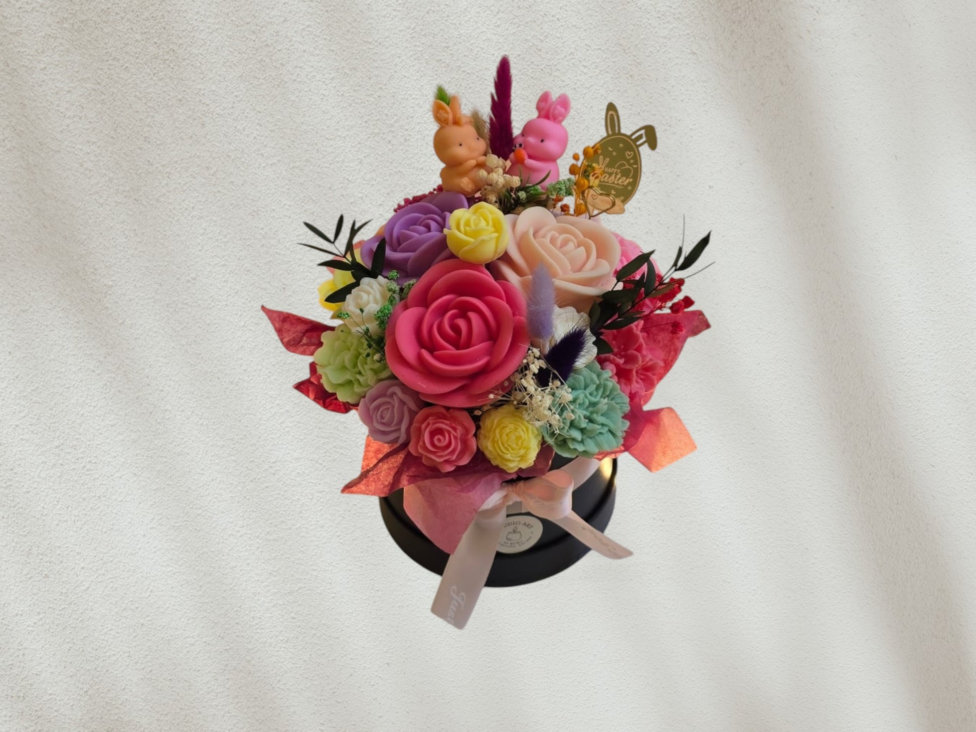 A festive Easter scented candle flower arrangement in a medium black box, combining vibrant flowers and a soothing fragrance to brighten any space.